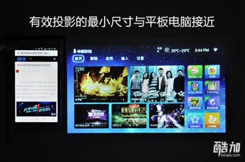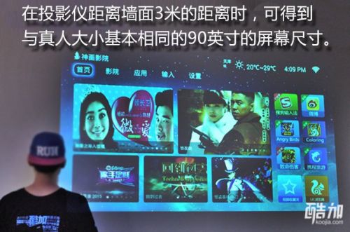 神画Z1几乎可以在任何你需要的平面上进行投影,经过实际测试,投影有效对焦的距离大约是从0.3M~30M,但随着投影屏幕的尺寸加大,其亮度与细节清晰度还是会有所损失,不过,你并不需要担心投影出的画面清晰度会减损到无法接受的地步,因为随着投影画面尺寸的增大,观赏距离也会相对变远,再加上智能动态对比度等技术的运用可以保证画面色彩不会过多流失,最主要的是1280*720的高清分辨率已经让神画Z1达到了家庭影院的效果。